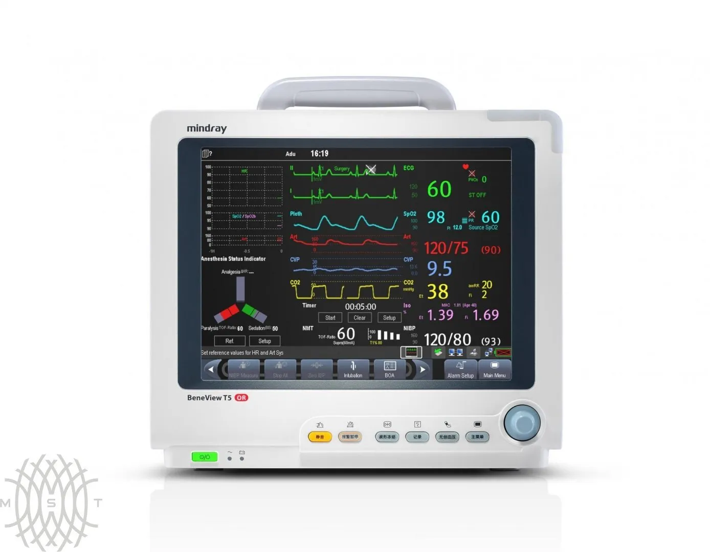 • Универсальный монитор Mindray Beneview T5 может использовать одновременно несколько систем и технологий – измерение параметров дыхания, импедансная кардиография, CCO, BISx / BISx4h, SvO2 и другие.