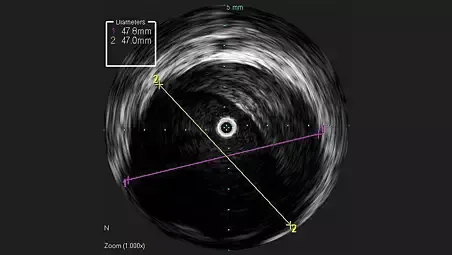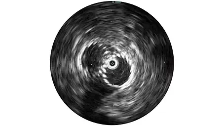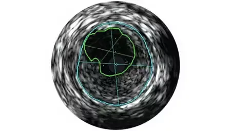 - Визуализация с использованием ВСУЗИ помогает диагностировать поражение, обеспечивая определение таких показателей, как процентное значение объема бляшки, расположение и морфология пораженного участка, степень кальцификации и наличие тромба. Она также позволяет выполнять анализ критически важных параметров, таких как параметры поперечного сечения просвета.