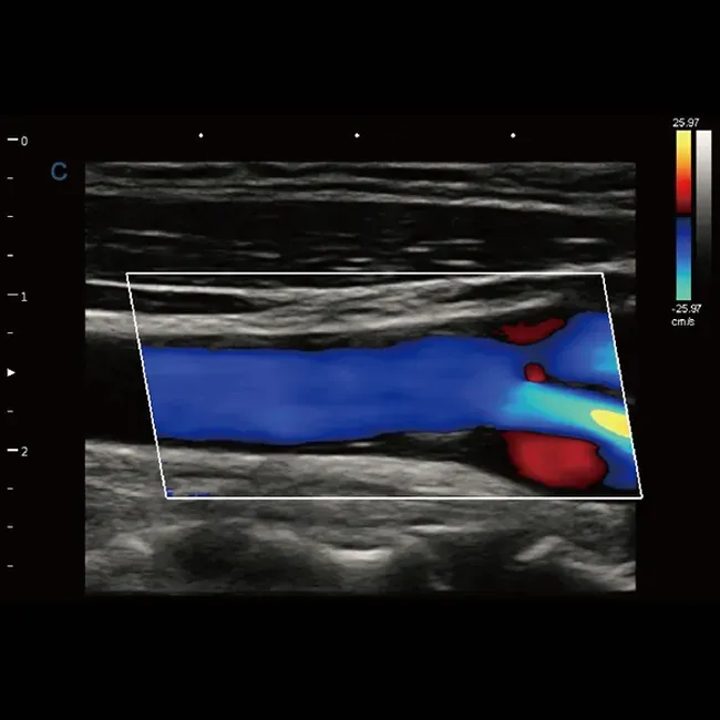 При исследовании сосудов и сердца необходимо использовать цветной доплер. Такая функция четко выделяет кровоток ярким цветом. Синим цветом определяется кровяной поток, который идет от датчика, а красным - поток, направляющийся к датчику. Турбулентный поток определяется в сине-зелено-желтых цветах.