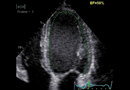 - Auto EF — данная функция, в основе которой лежит алгоритм 2D спекл-трекинга, позволяет проводить вычисления наиболее часто используемых параметров для оценки функции ЛЖ.